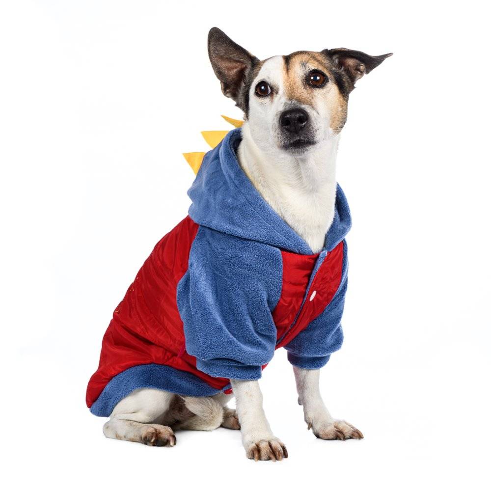Куртка красная с капюшоном дракоша из новой коллекции Petmax – практичный повседневный костюм для прогулок холодными зимними днями.