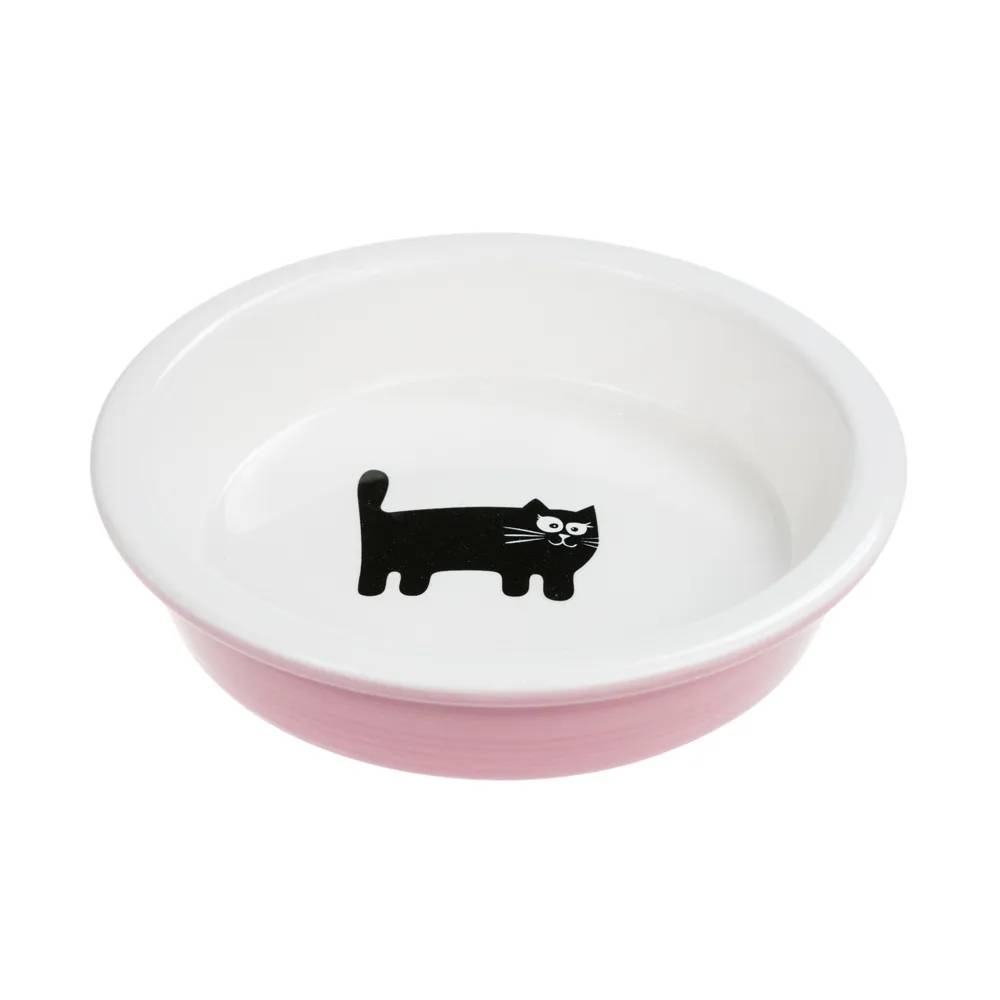 - Снаружи миска розовая, внутри белая с оригинальным рисунком "черный кот".