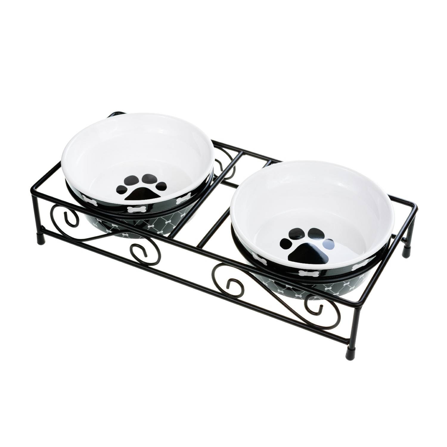 Миски для собак двойная на подставке черная керамика с лапами, две миски объемом 250 мл, диаметр 13 см.