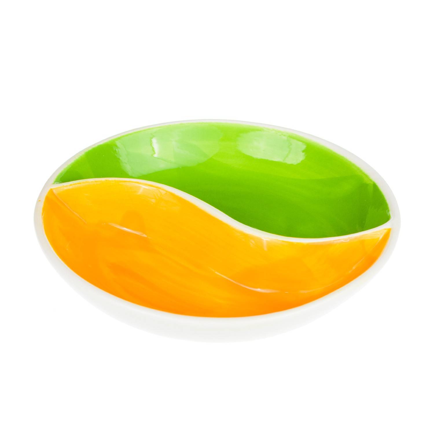 Миска для кошек и собак керамическая с разделителем оранжево-зеленая керамика, диаметр 12,5 см.