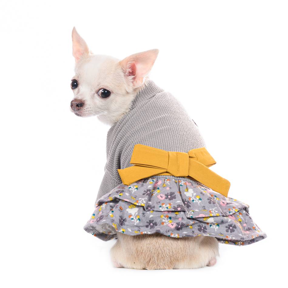 Платье-свитер серого цвета украшено цветной юбочкой и ярким жёлтым бантом на спине. Ваша маленькая модница не останется незамеченной. Аксессуар подходит для повседневного ношения, праздничных мероприятий и для проведения фотосессий.