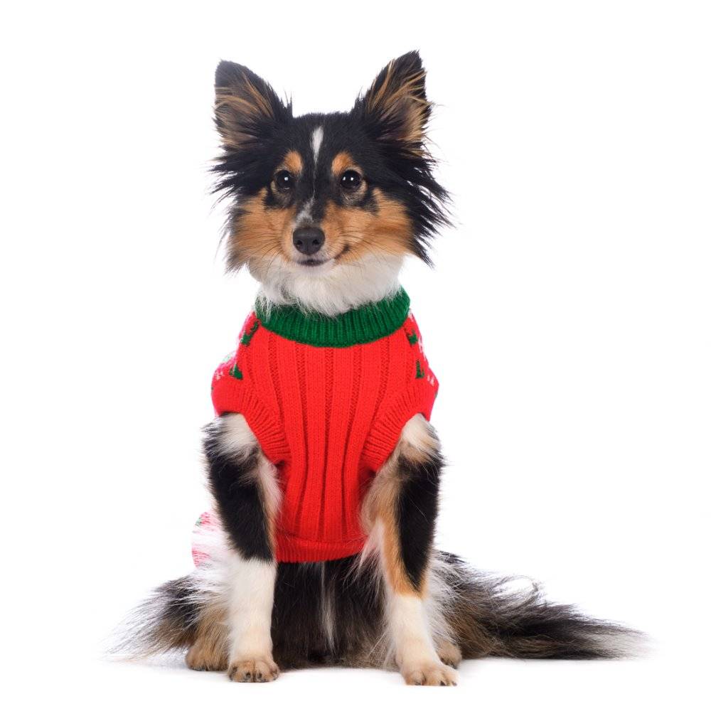 Свитер для собак красного цвета с узором в новогодней тематике станет прекрасным подарком вашему питомцу.