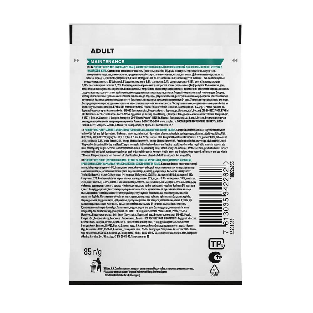 Команда квалифицированных ветеринарных специалистов разработала влажный корм PURINA® PRO PLAN® Sterilised Adult MAINTENANCE для взрослых кошек. Этот полнорационный корм для кошек с индейкой легко усваивается, отличается сбалансированным составом и способствует поддержанию здоровья питомца.