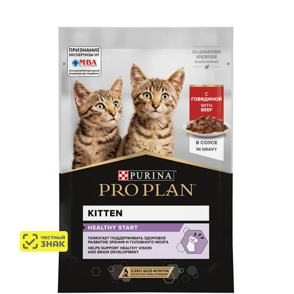 Команда квалифицированных ветеринарных специалистов разработала влажный корм PURINA® PRO PLAN® HEALTHY START для здорового развития котенка. Этот полнорационный корм для кошек с говядиной подходит для повседневного кормления питомцев в возрасте до 12 месяцев, а также беременных и кормящих кошек.