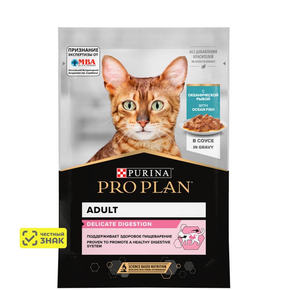 Команда квалифицированных ветеринарных специалистов разработала влажный корм PURINA® PRO PLAN® DELICATE DIGESTION для взрослых кошек с чувствительным пищеварением. Этот полнорационный корм для кошек с океанической рыбой легко усваивается и подходит для повседневного кормления питомцев с проблемами пищеварения.