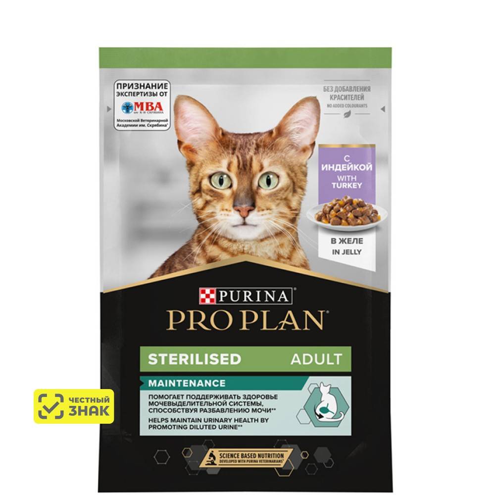Команда квалифицированных ветеринарных специалистов разработала влажный корм PURINA® PRO PLAN® Adult STERILISED MAINTENANCE для взрослых стерилизованных кошек. Этот полнорационный корм для кошек с индейкой подходит для ежедневного кормления и полностью отвечает индивидуальным потребностям организма стерилизованных питомцев.