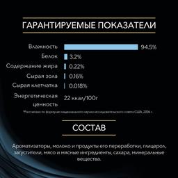 Отличный вариант замены воды в рационе. Удобная упаковка, можно разделить на несколько приемов, привлекательный вкус для кота. Подробно описан состав, легко рассчитать нужное количество белка для рациона.
