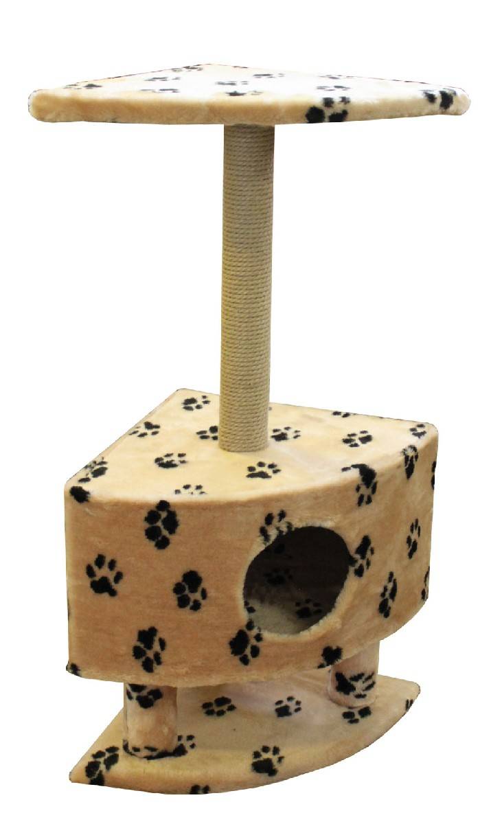 Домик для кошек Угловой на ножках (бежевый с лапками) Характеристики: Основание: 43 х 43 см. Высота: 98 см. Домик изготовлен из ДСП, обивка – искусственный мех. Когтеточка изготовлена из джута. Способ размещения: Напольные. Количество уровней: Двухуровневые.