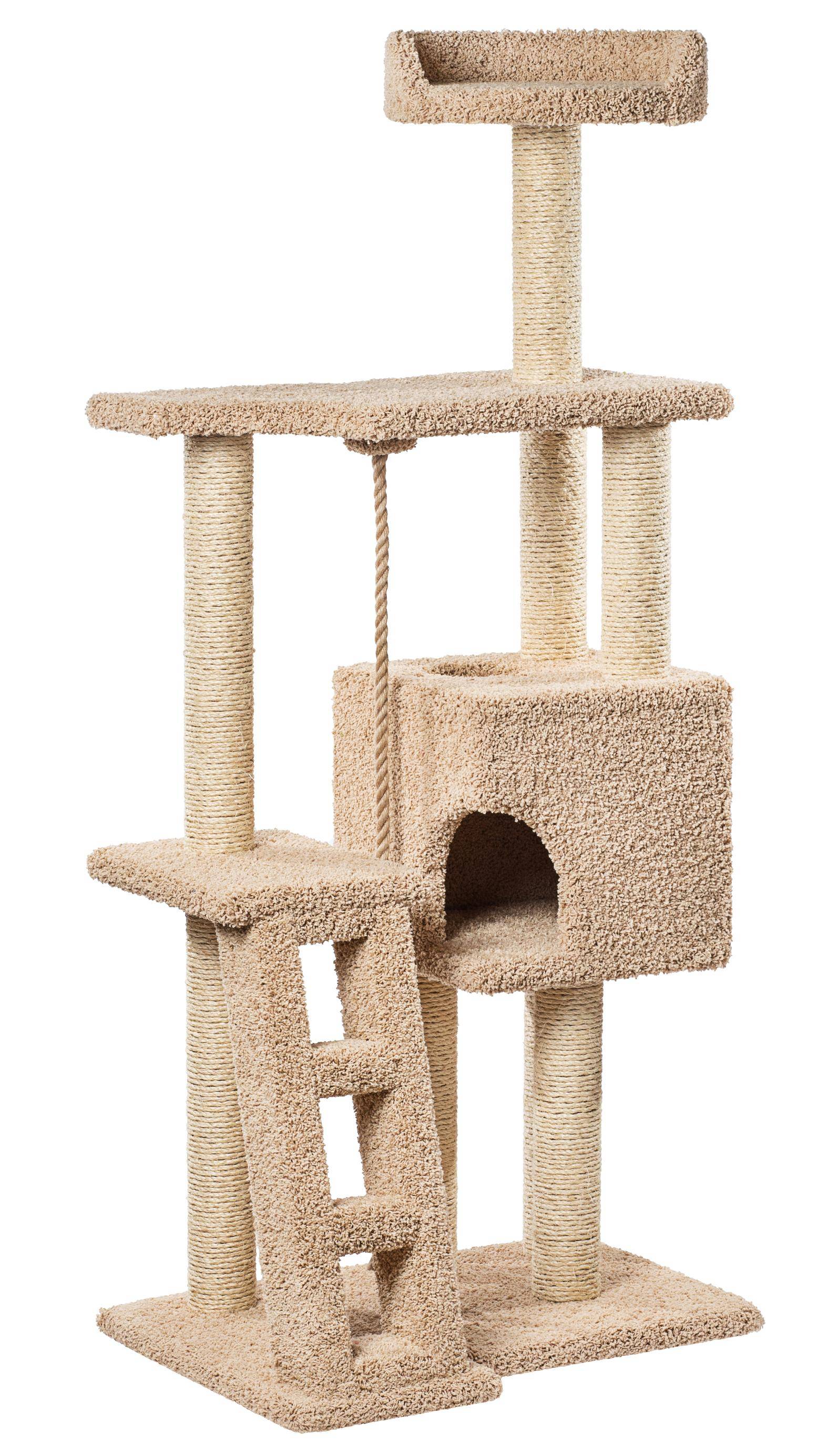 Когтеточка - комплекс для кошек Сиричка Характеристики: Основание - 80*60 см. Домик - 40*40 см. Верхняя лежанка - 40 см. в диаметре. Обмотка на столбах - сизаль. Диаметр столбов - 11 см. Обивка - ковролин. Вес 35 кг.
