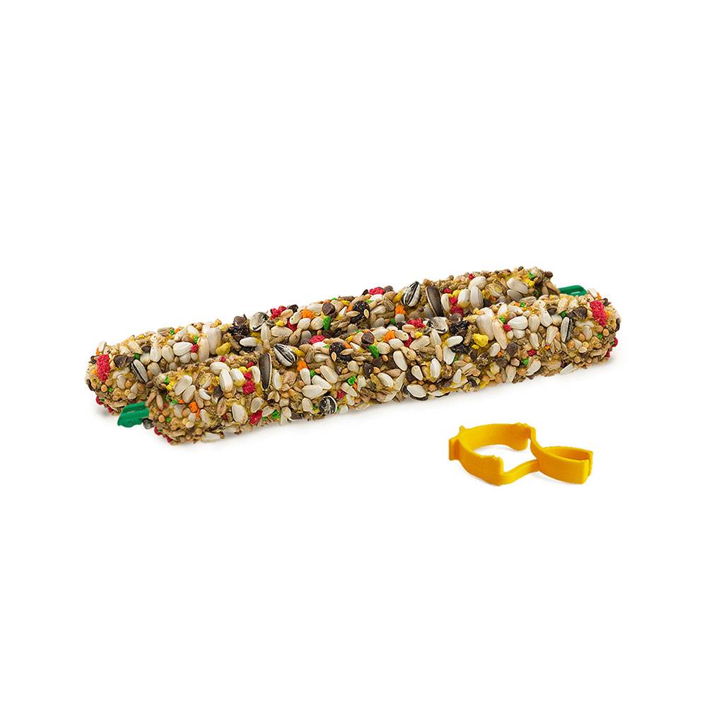 - Палочки с тропическими фруктами – вкусное и полезное лакомство для разнообразия рациона неразлучников, корелл, каиков, пиррур и других средних попугаев.