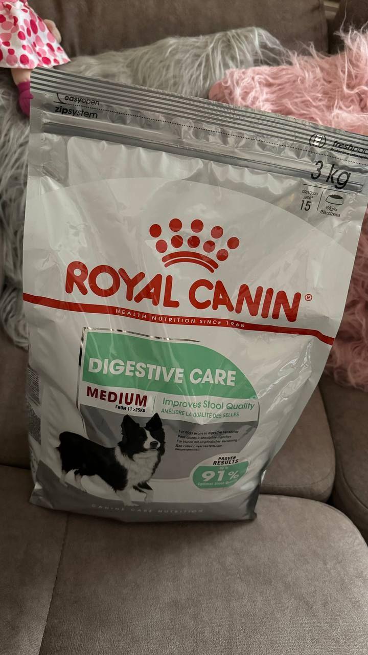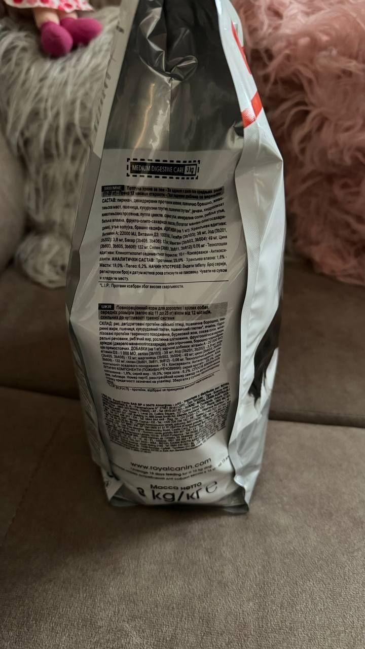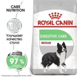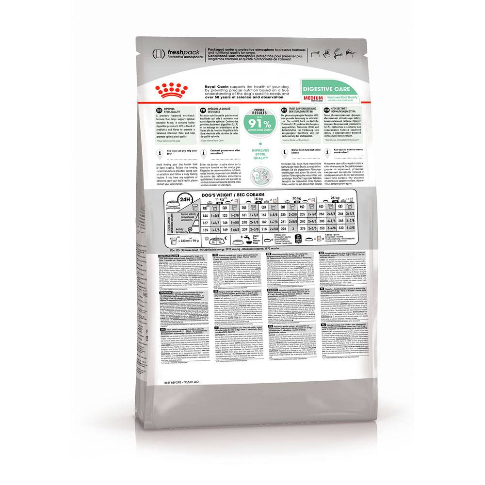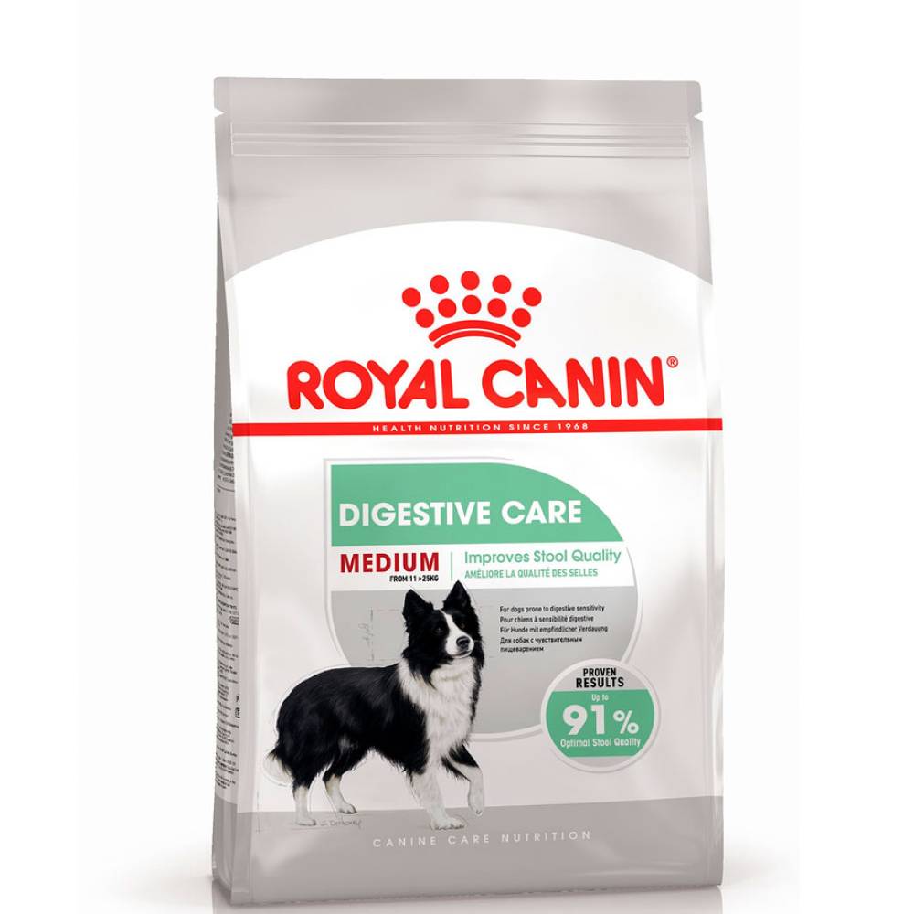 Полнорационный сухой корм Royal Canin Medium Digestive Care для взрослых (старше 12 месяцев) и стареющих собак средних размеров (вес собаки от 11 до 25 кг) с повышенной чувствительностью пищеварительной системы. Максимальная пищевая переносимость достигается благодаря высококачественным источникам белка, а также фрукто- и манноолигосахаридам, которые нормализуют кишечную флору и улучшают консистенцию стула. Усиливает блеск шерсти, в частности, благодаря жирным кислотам Омега 6.