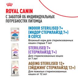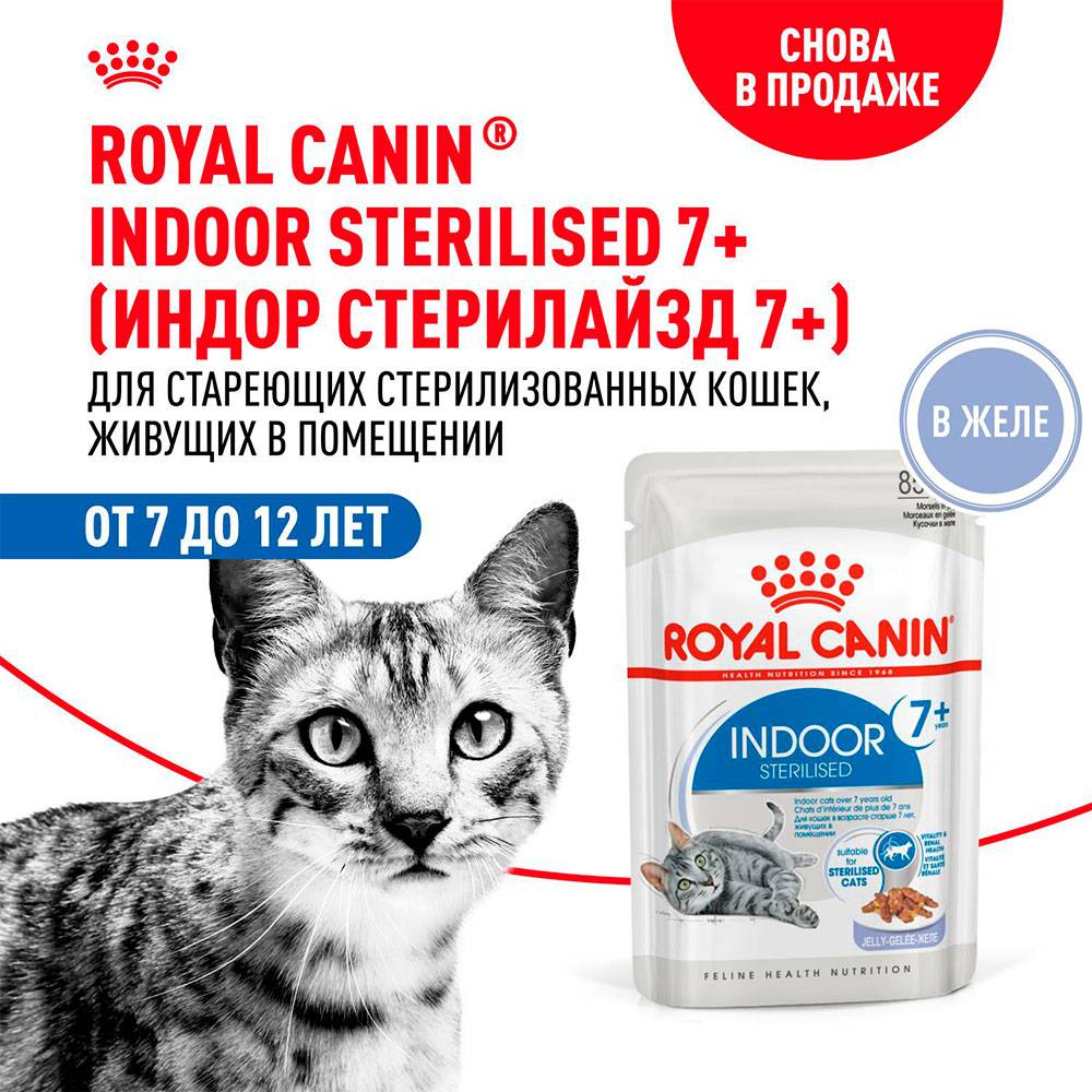 Корм консервированный полнорационный для кошек (в возрасте от 7 до 12 лет), живущих в помещении INDOOR STERILISED 7+ (ИНДОР СТЕРИЛАЙЗД 7+), мелкие кусочки в желе ROYAL CANIN®, подходящий для взрослых кастрированных и стерилизованных кошек, живущих в помещении , специально разработан с учетом потребностей вашей кошки в питательных веществах.