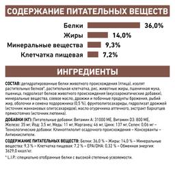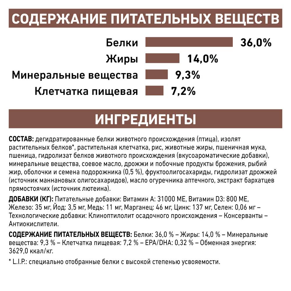 дегидратированные белки животного происхождения (птица), изолят растительных белков*, растительная клетчатка, рис, животные жиры, пшеничная мука, пшеница, гидролизат белков животного происхождения (вкусоароматические добавки), минеральные вещества, соевое масло, дрожжи и побочные продукты брожения, рыбий жир, оболочки и семена подорожника – 0,5 %, фруктоолигосахариды, гидролизат дрожжей (источник маннановых олигосахаридов), масло огуречника аптечного, экстракт бархатцев прямостоячих (источник лютеина).