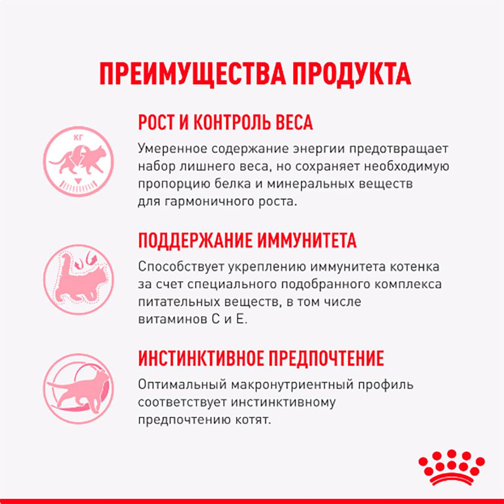 - Способствует укреплению имунной системы котенка за счет специального подобранного комплекса питательных веществ, в том числе витаминов С и Е.