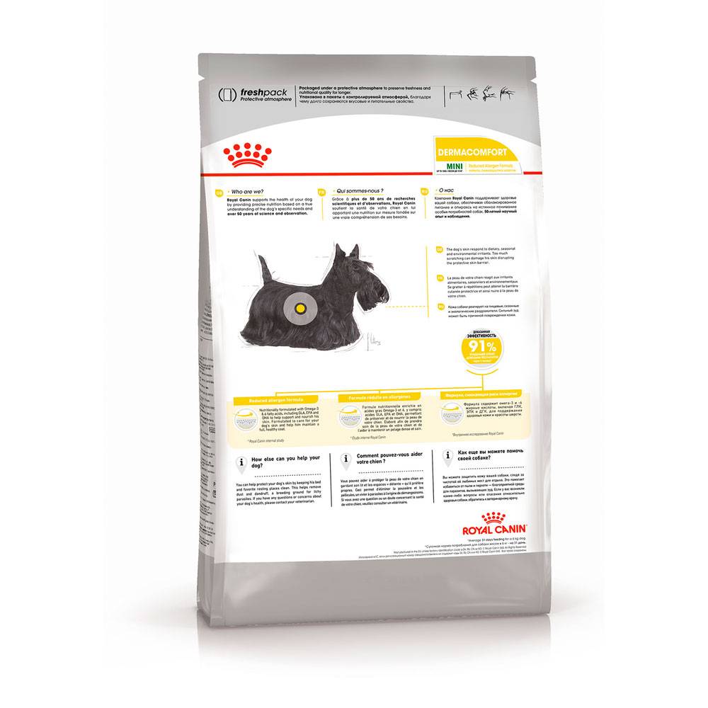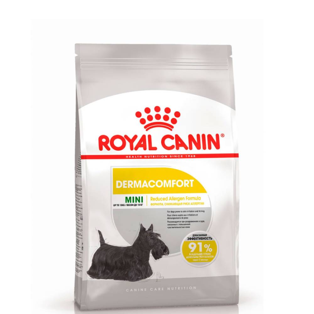 Mini Dermacomfort сухой корм для собак маленьких пород от Royal Canin отлично подходит питомцам, склонных к кожным раздражениям и зуду. Благодаря специально подобранным ингредиентам корм обладает ароматом, стимулирующим аппетит. Размер, форма и плотность крокет специально разработаны для небольших собак. Каждый кусочек сухого корма в форме подушечки, хрустящей снаружи и мягкой внутри, имеет аппетитную текстуру, привлекательную для собак.