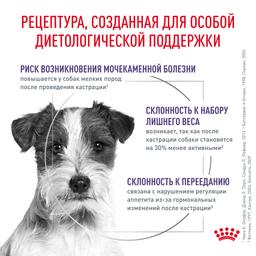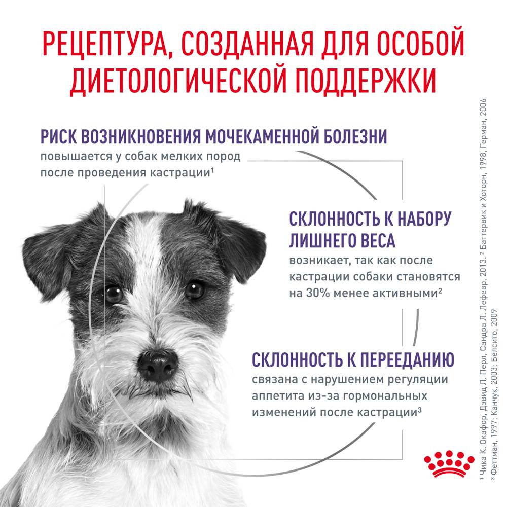 Сухой корм ROYAL CANIN® NEUTERED ADULT SMALL DOGS (НЬЮТРИД ЭДАЛТ СМОЛ ДОГЗ) - полнорационный корм для стерилизованных или склонных к набору веса взрослых собак мелких пород (до 10 кг). После кастрации/стерилизации собаки мелких пород из-за снижения активности могут быть склонны к набору веса и развитию мочекаменной болезни. Специальный рацион с повышенным содержанием клетчатки помогает поддрживать идеальный вес. Формула способствует созданию в мочевыделительной системе среды, неблагоприятной для формирования как струвитных, так и оксалатных кристаллов.
