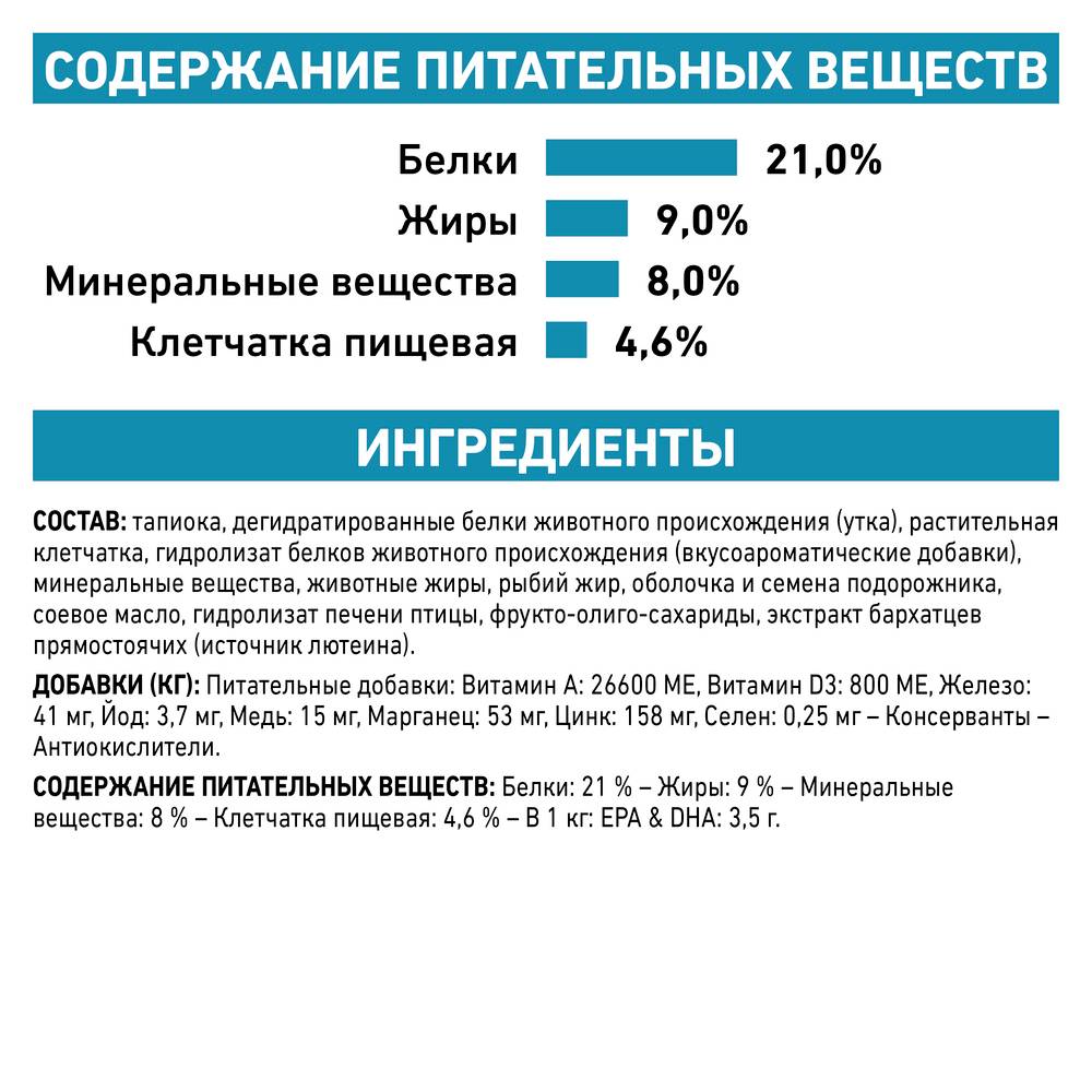 - Ненасыщенные жирные кислоты для поддержания здоровья кожи и пищеварения. Корм способствует сохранению естественного защитного барьера кожи