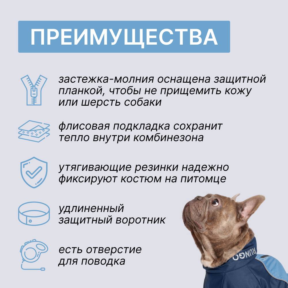 Теплый комбинезон для собак от бренд RUNGO – простой и эффективный способ сделать прогулку с собакой комфортной в любую непогоду. Комбинезон защитит Вашего питомца от сырости, загрязнений и переохлаждения.
