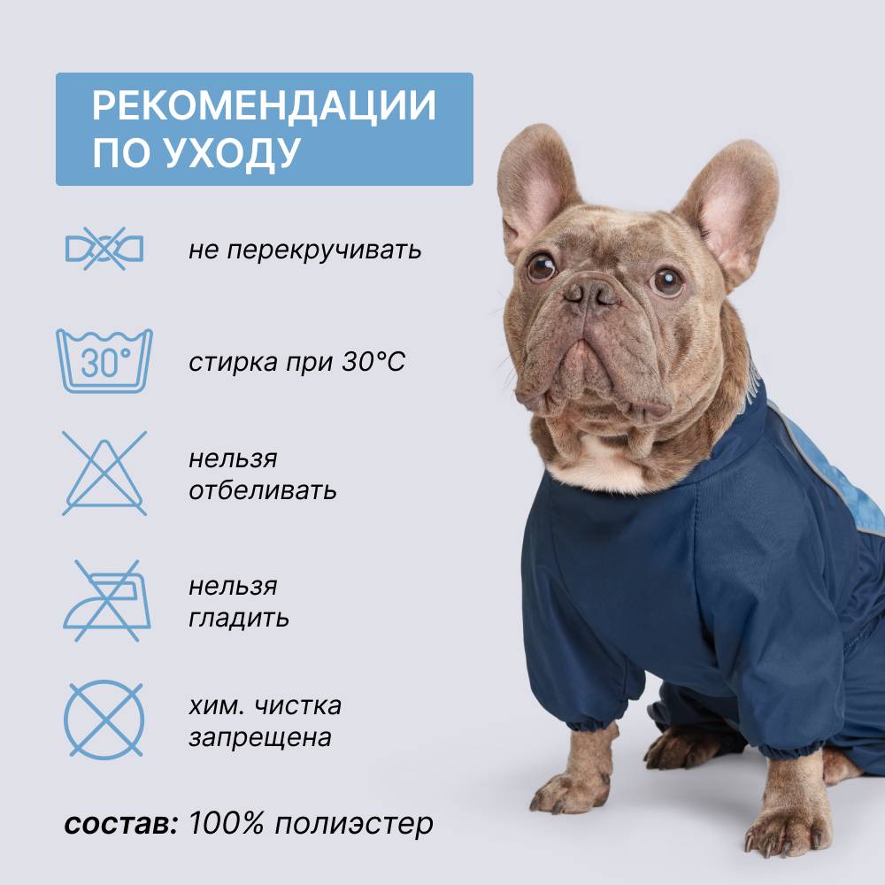 Рекомендации по уходу: стирка при 30 градусах, не отжимать, не отбеливать, не гладить, химчистка запрещена.
