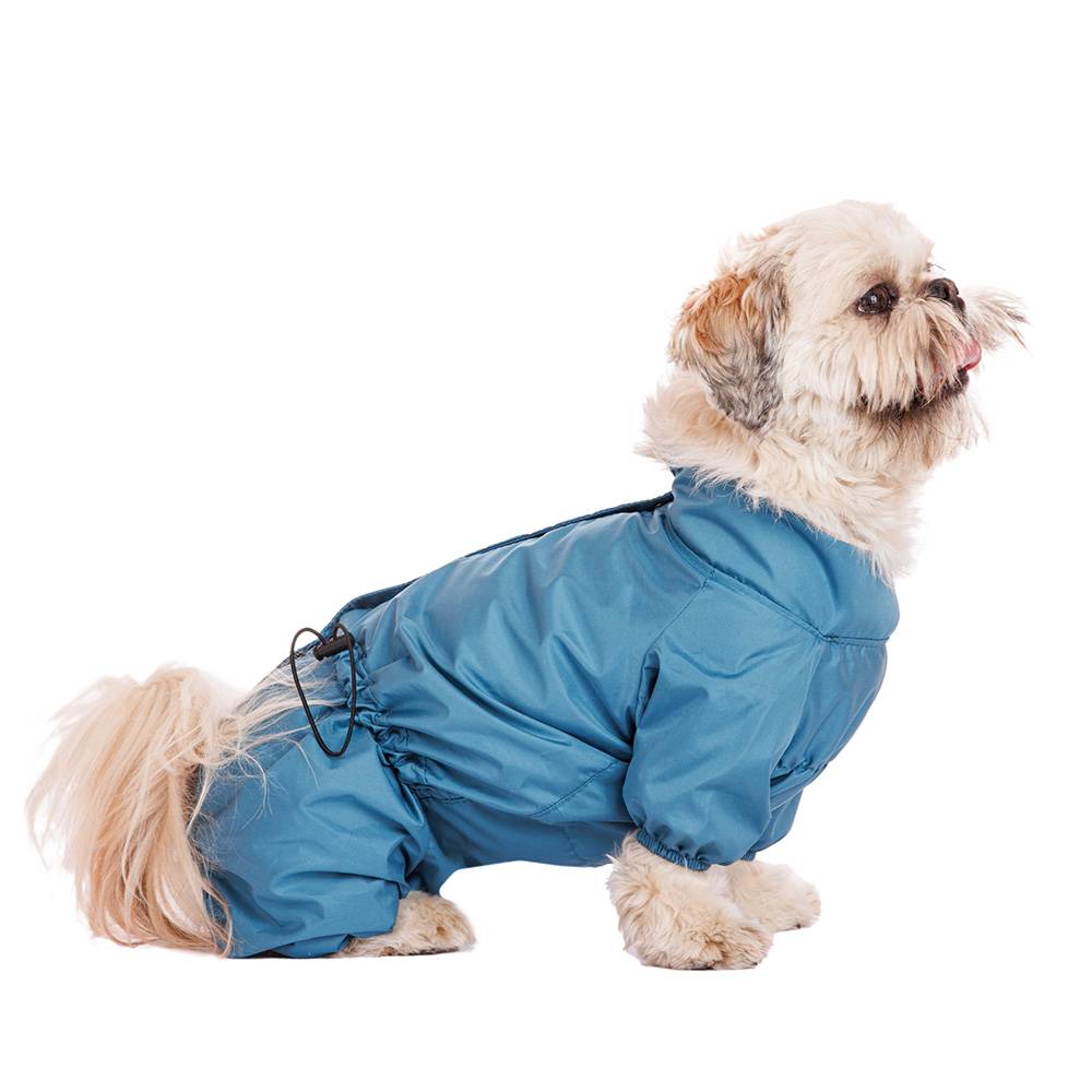 - Крой дождевика надежно защищает живот, идеально для собак с короткими лапами.
