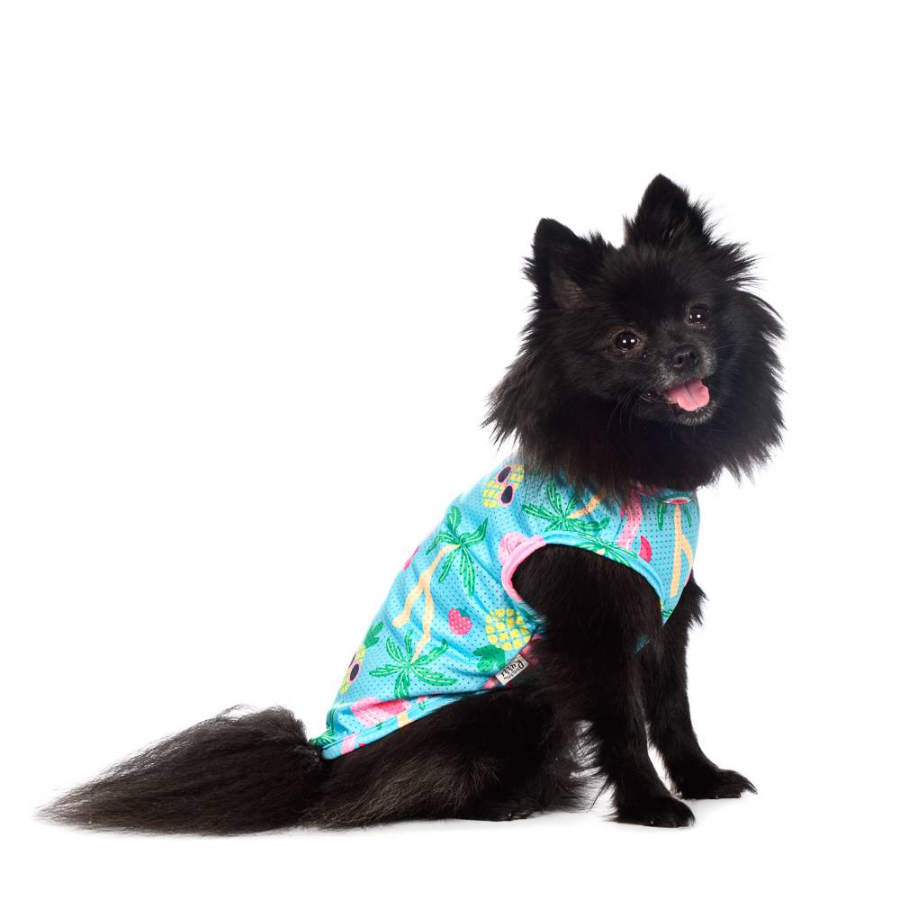 Летний и сочный наряд для вашего пушистого модника: голубая футболка с модным принтом в стиле pool party - с фламинго, коктейлями, мороженым и сочными фруктами. В этой футболке ваша собака точно не останется незамеченной.