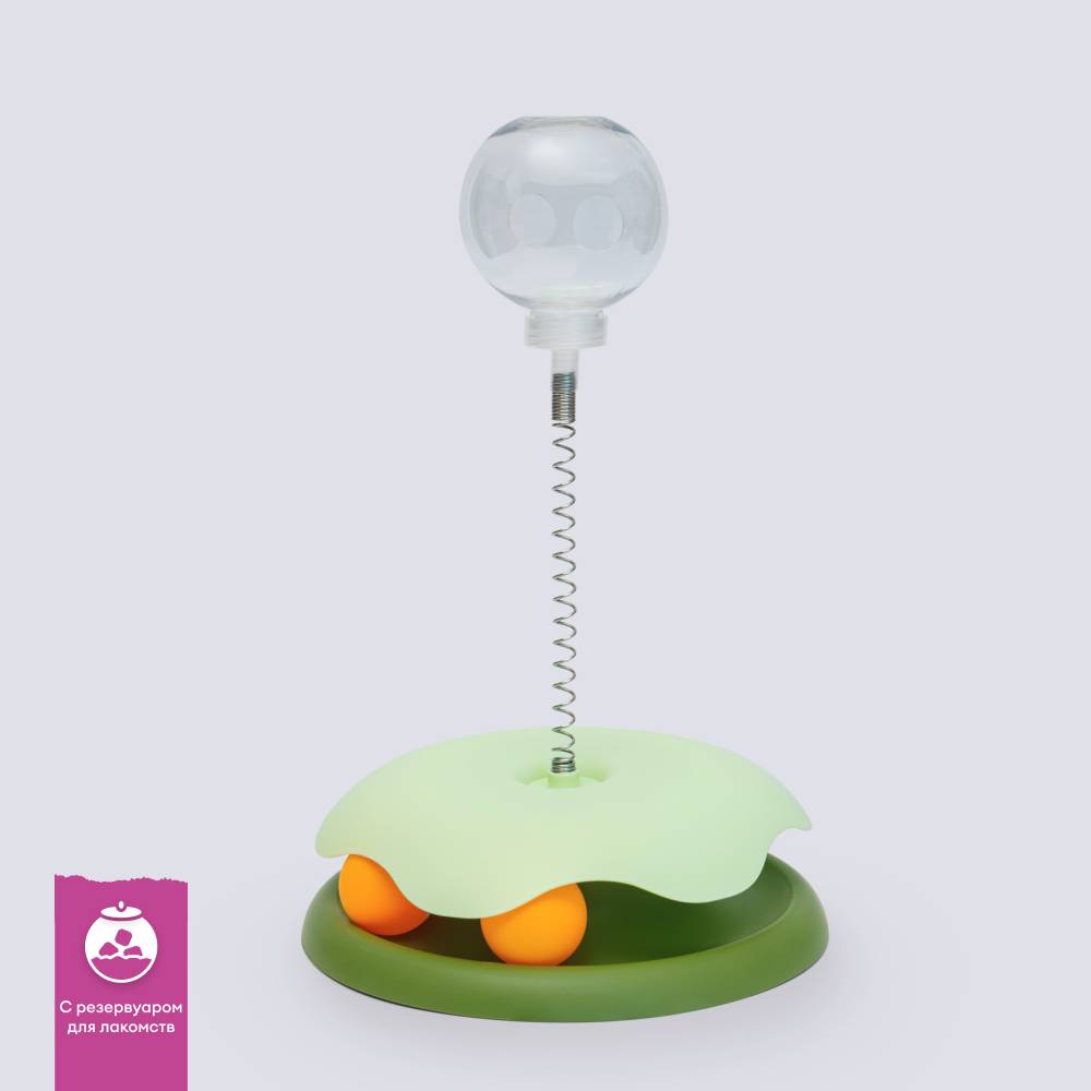 - Конструкция состоит из подставки с шариками, пружины и резервуара для лакомств.