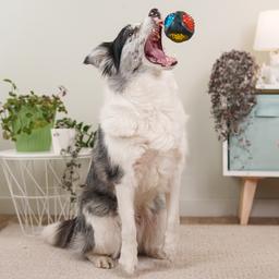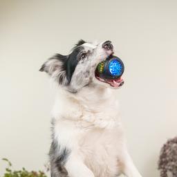 Любимый мяч, уже 5 сменили, единственное за чем следить надо это за свет шариком внутри, если игрушка разгрызена есть вероятность того, что кусочки шарика попадут в рот хвостатому.
