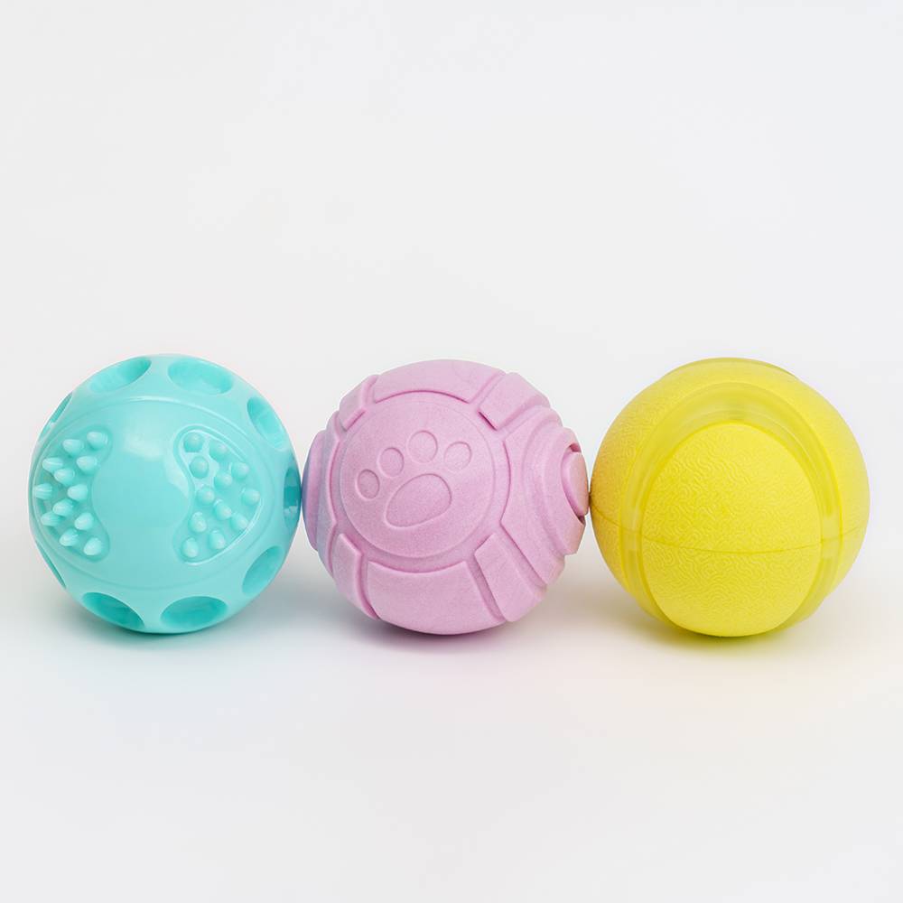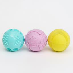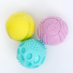 - В комплекте три разноцветных резиновых мячика, один из них пищит при нажатии.