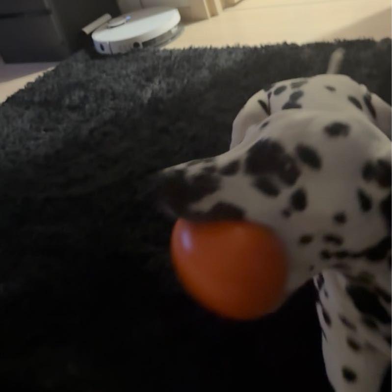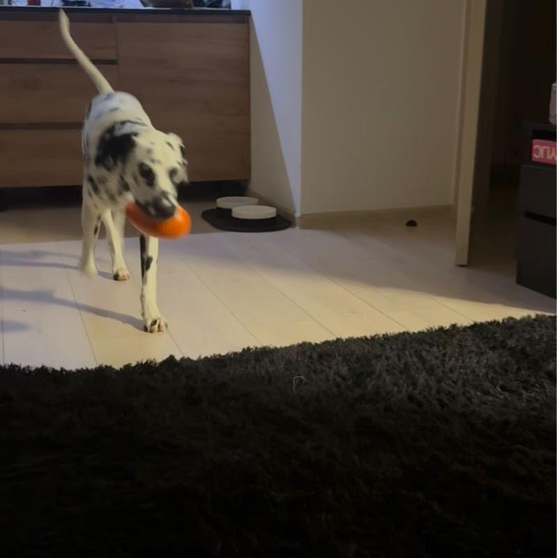 - Собака пытается взять игрушку в пасть, но не получается – яйцо ускользает, побуждая питомца предпринимать новые и новые попытки.