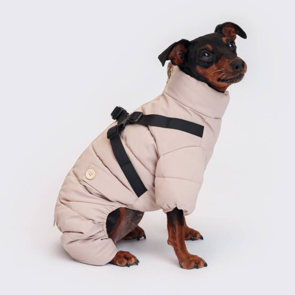 - К комбинезону пришита шлейка с креплениями для поводка .