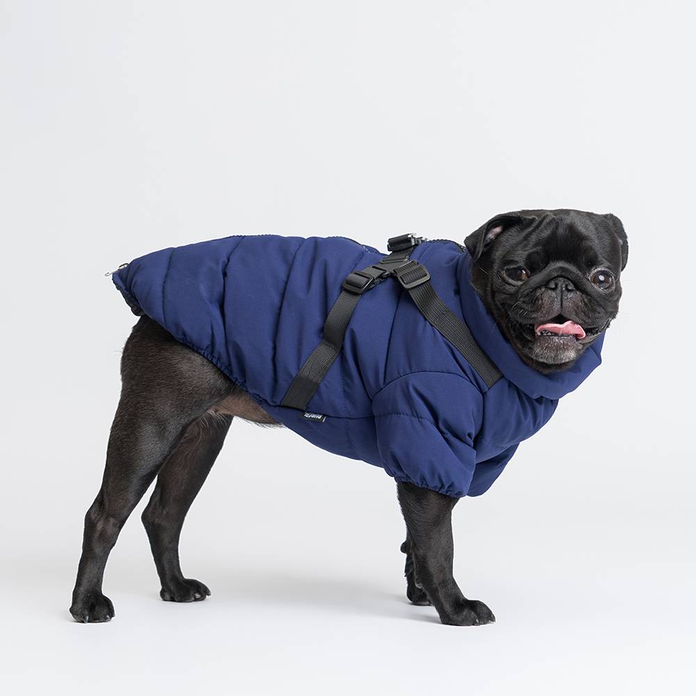 - К куртке пришита шлейка с застежкой фастекс и металлическими кольцами для крепления поводка.