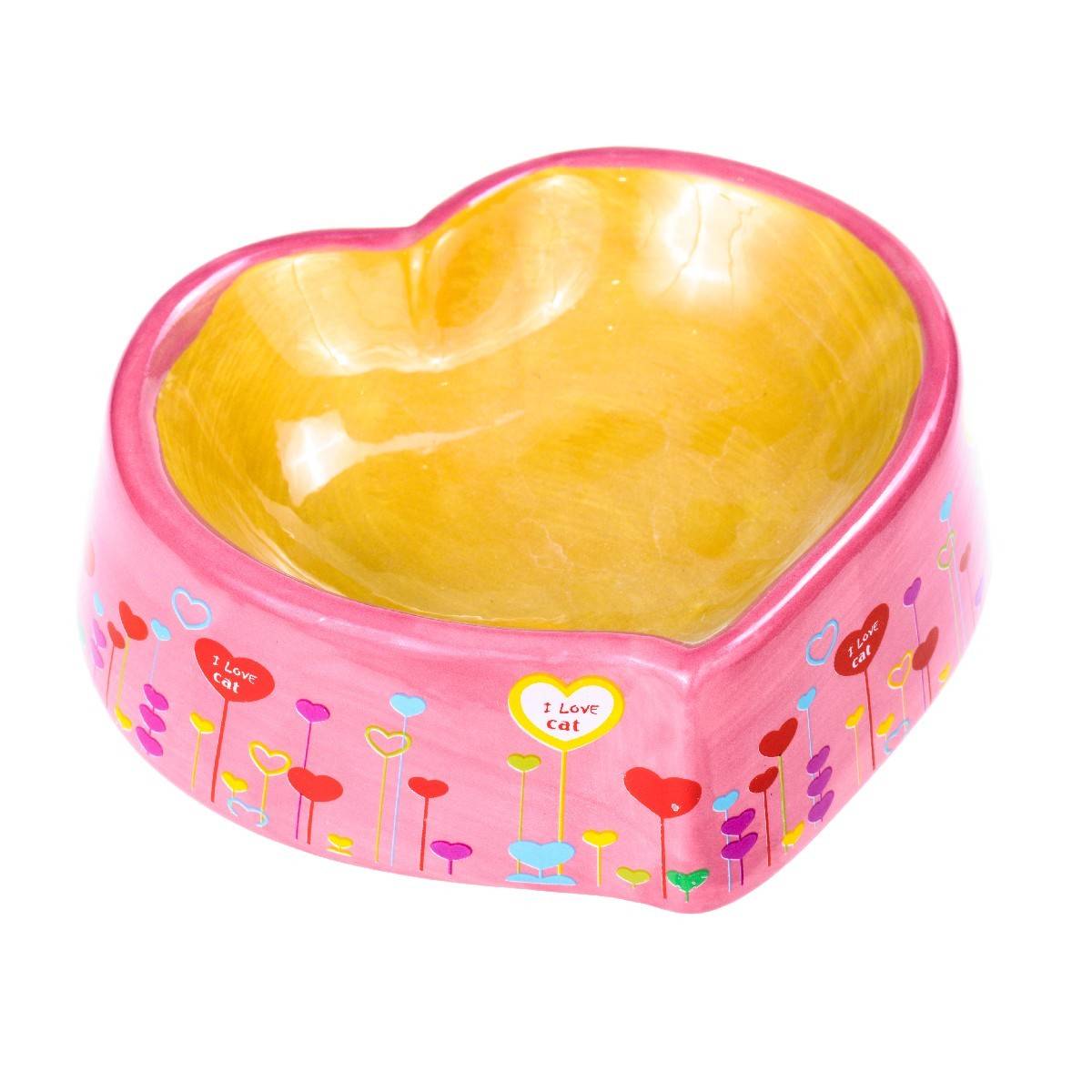 Миска для кошек и собак керамическая, золотисто-розовая в форме сердца, с рисунком на внешней стороне, диаметр 17 см.