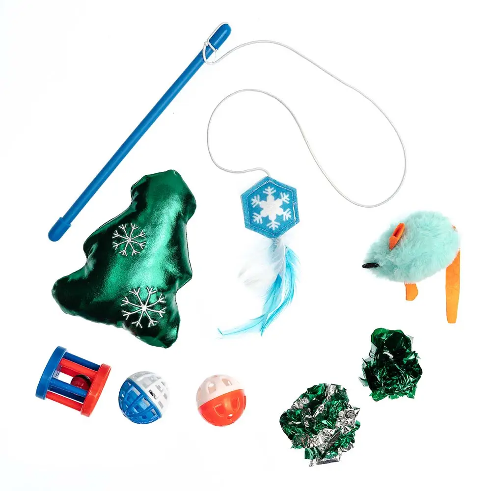 - Выгодная покупка: несколько шуршащих шариков, мышка, мячики с бубенчиками внутри, дразнилка, мягкая игрушка "елочка", барабан с мячиком внутри в одной упаковке.