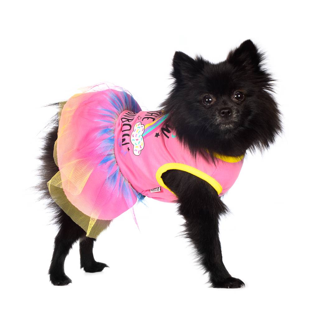 Летний и сочный наряд для вашей пушистой модницы: розовое платье с радугой, в котором ваша собака точно не останется незамеченной. Надевайте платье для прогулки в парке или на праздник. Устройте фотосессию и сделайте снимок счастливых моментов вместе со своим питомцем.