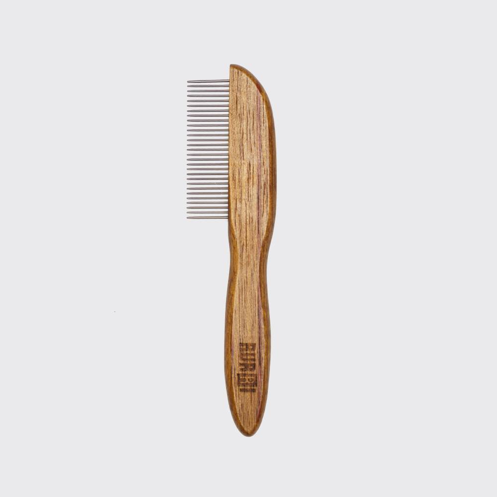 Расческа с частыми зубьями из коллекции ECO от бренда RURRI тщательно прочёсывает шерсть, избавляя от мельчайших спутываний, прекрасно удаляет старые волоски и грязь, способствуя оздоровлению и росту новой шерсти.