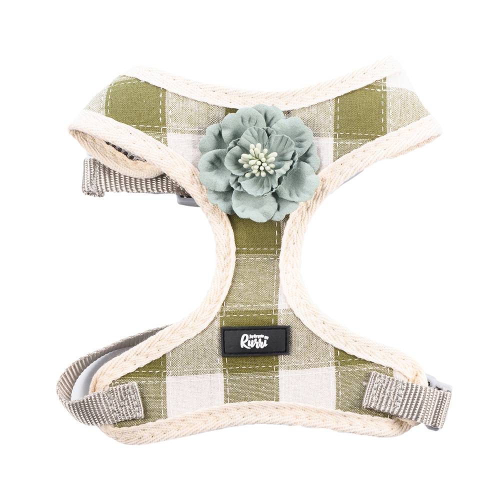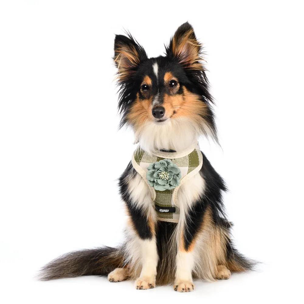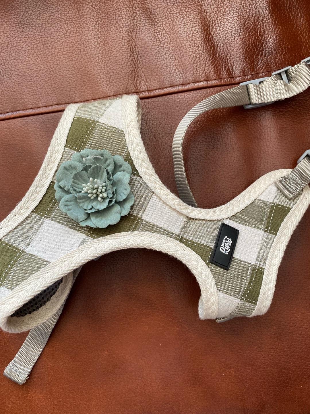 Шлейка зеленая с цветочком. Легкая шлейка позволит во время прогулки контролировать передвижения питомца, без риска повредить шею ошейником при резких рывках. Подобная амуниция будет незаменима для прогулок с активными, любопытными или пугливыми питомцами.