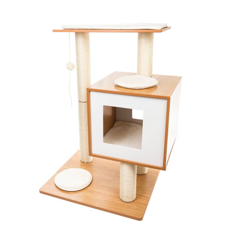 RURRI Спально-игровой комплекс для кошек с домиком и когтеточкой Leia трёхъярусный с игрушкой, коричневый/белый, 56x56x82см