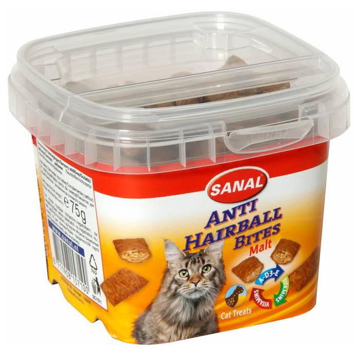 Подушечки SANAL Anti Hairball Malt Bites — восхитительное хрустящее лакомство со вкусом птицы для вывода шерсти у кошек и котят.