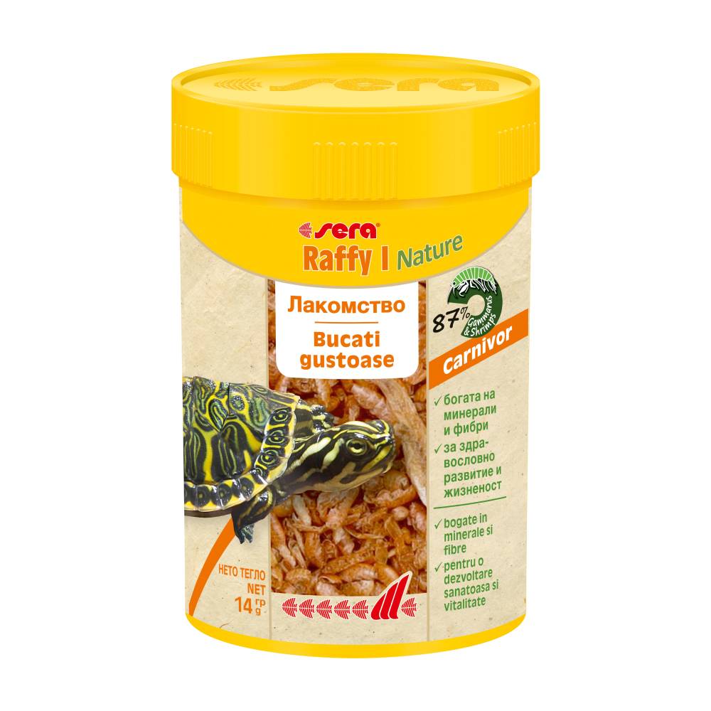 Sera Raffy I Nature - это лакомство без красителей и консервантов, состоящее из натурального, мягко высушенного гаммаруса (43,5%), креветок (43,5%), мелкой рыбы и криля для водяных черепах и других (иногда) хищных мелких рептилий, а также земноводных. Смесь, которая представляет естественный спектр питания, богата оптимально используемым белком, омега-жирными кислотами, ценными каротиноидами, минералами и микроэлементами, а также волокнами, которые регулируют пищеварение. Эта привлекательная закуска при регулярном кормлении поддерживает устойчивость к болезням, развитие и активность.