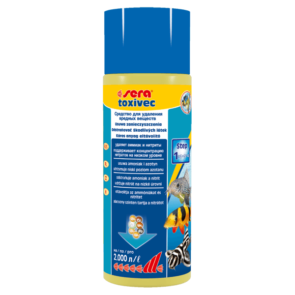 Sera Toxivec, содержащие формулу QuickClean, устраняет опасные загрязнители, амиак, нитриты, агрессивный хлор из водопроводной воды, угрожающей полезным бактериям. Средство также предотвращает рост нежелательных водорослей.