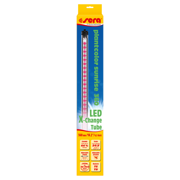 Sera LED Plantcolor Sunrise 360 мм 4,3W 20 V - светодиодная лампа подчеркивает цвет света для комфортного роста растений в пресноводных аквариумах. Позволяет имитировать восходы и закаты, что благотворно сказывается на росте растений и фотосинтезе.