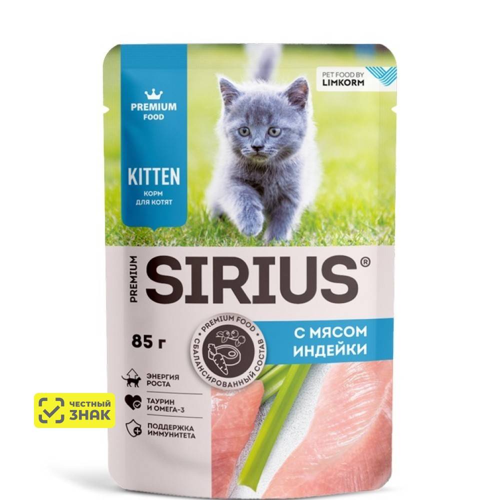 SIRIUS — влажный корм премиум-класса для полноценного ежедневного рациона котят с 1-2-х месяцев до 1 года. Высококачественный продукт создан специально для маленьких питомцев. Корм содержит натуральные ингредиенты, а также все необходимые микроэлементы и витамины, которые нужны для здоровья, роста и развития котенка.