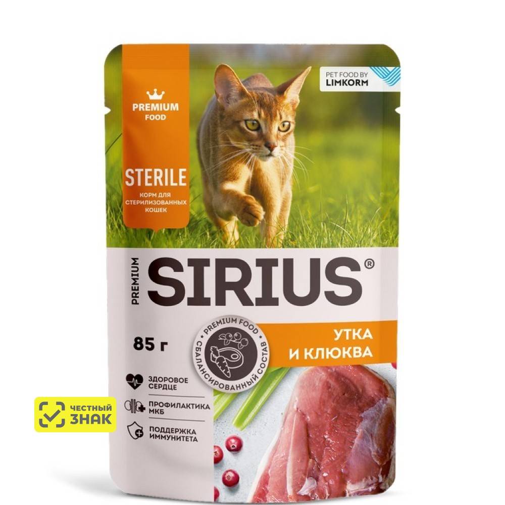 SIRIUS — влажный корм премиум-класса для полноценного ежедневного рациона стерилизованных кошек.