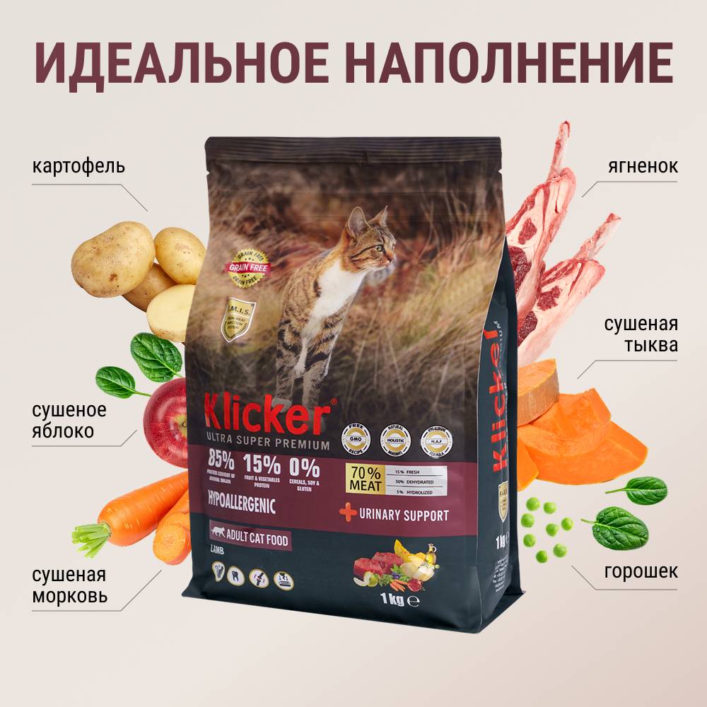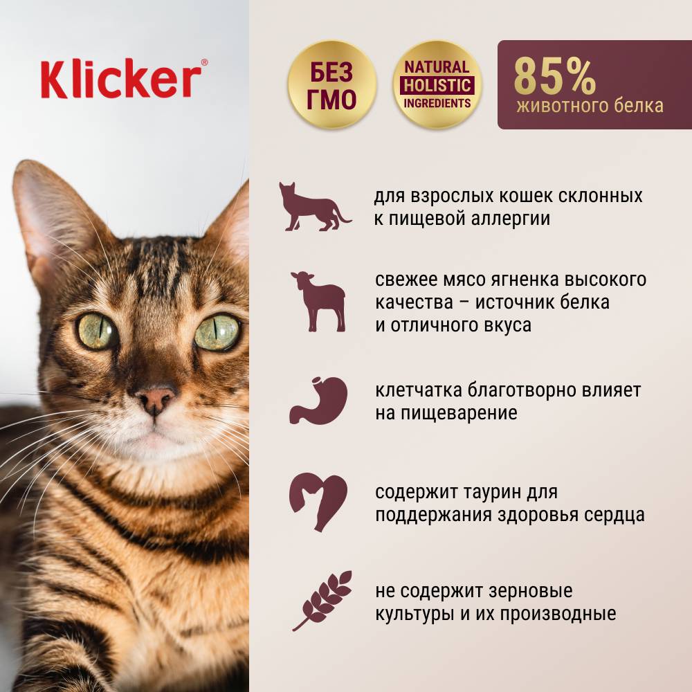 Корм Klicker с ягненком для взрослых кошек – это полнорационный сухой рацион класса холистик, который ваш усатый питомец будет есть с удовольствием и пользой для здоровья. Корм приготовлен из свежей и вяленой баранины высокого качества с добавлением овощей, фруктов и необходимых натуральных добавок.