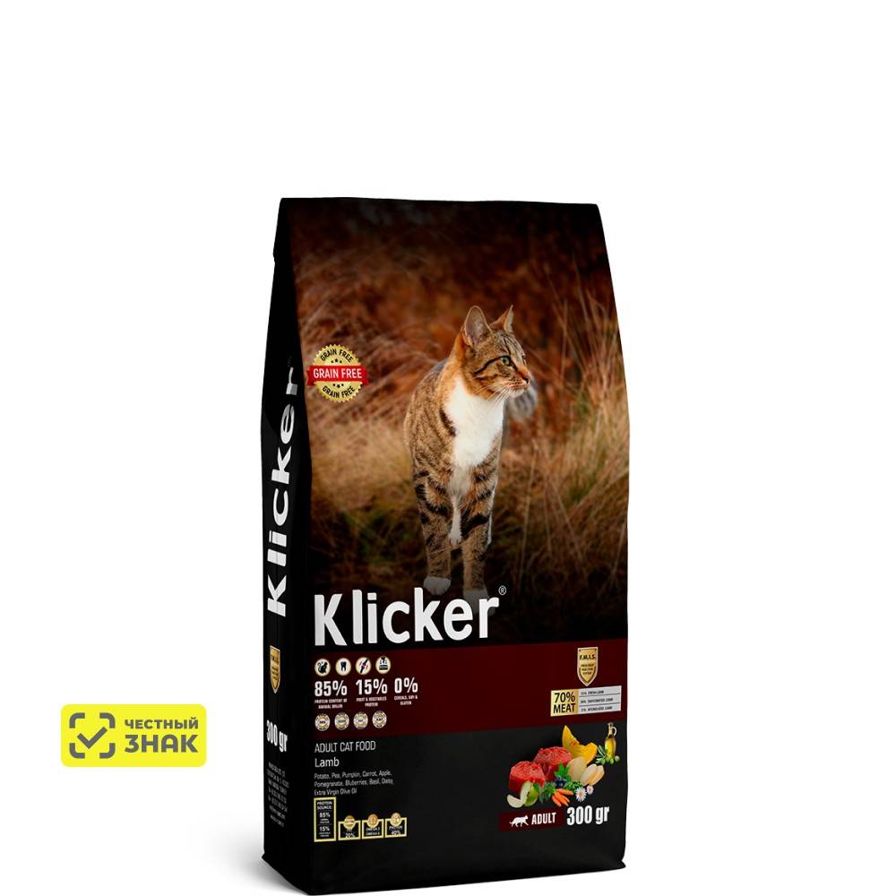 Klicker Adult Cat Food Hypoallergenic с ягненком для взрослых кошек склонных к пищевой аллергии – это полнорационный сухой корм класса холистик, приготовлен с использованием системы впрыска свежего мяса, это технология которая делает его еще более аппетитным для вашего питомца.