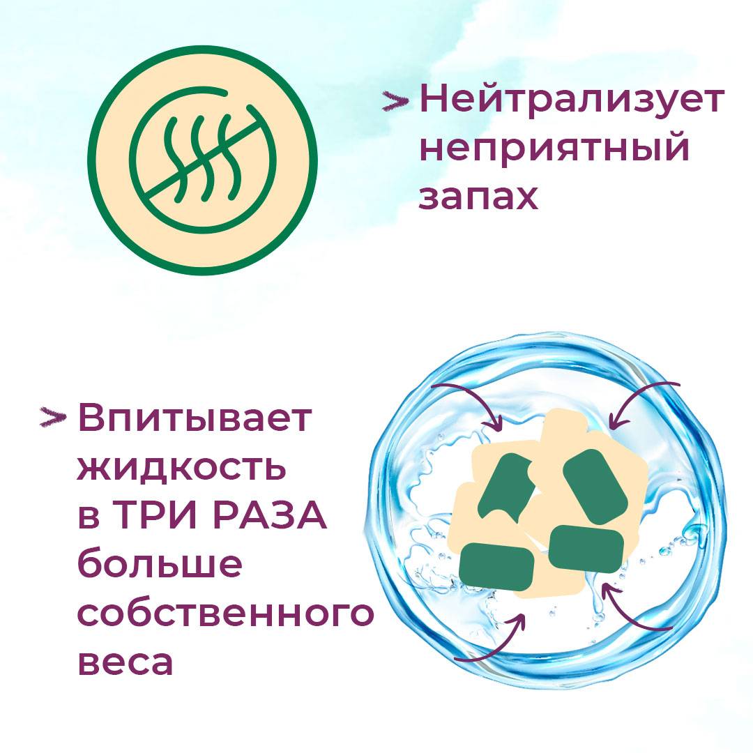 - При попадании жидкости он образовывает плотный комок, который можно утилизировать в канализацию - ведь при попадании в большое количество воды, комок распадется на хлопья и не приведет к засору.