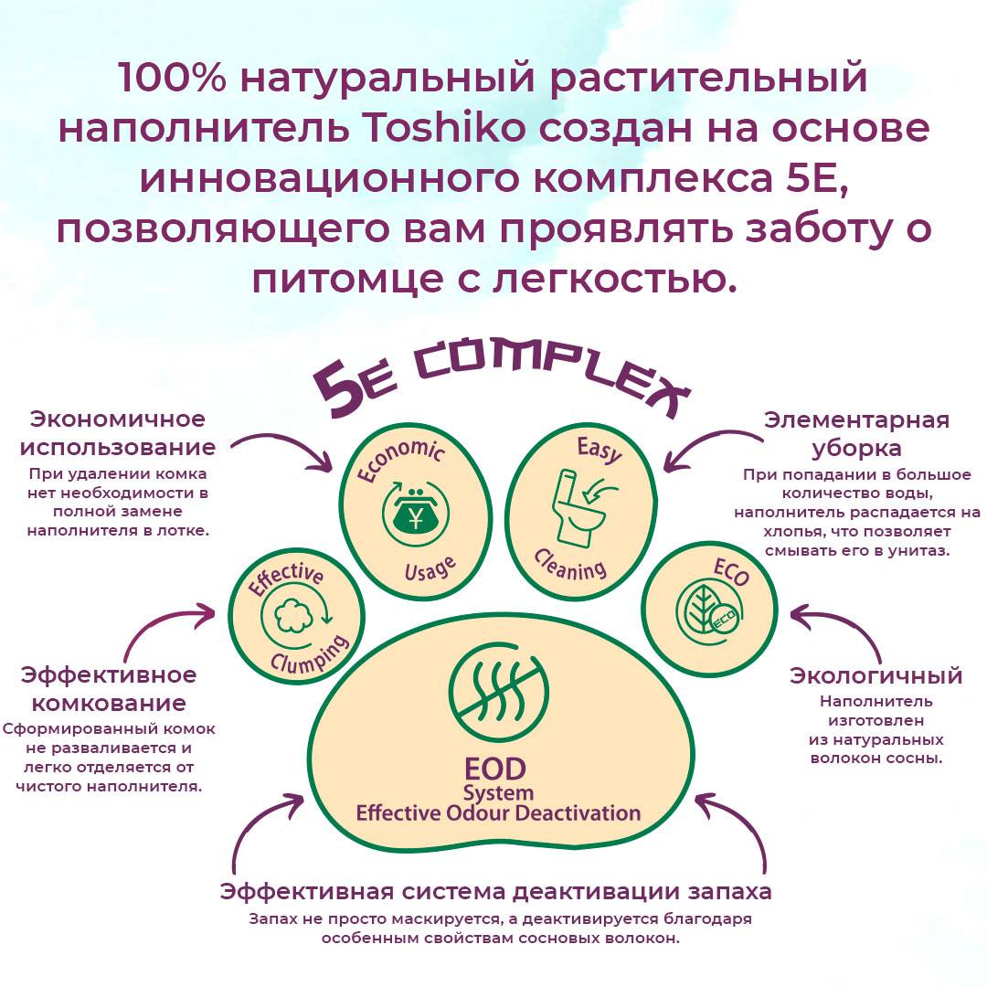 - Растительный наполнитель Toshiko создан на основе инновационного комплекса 5E, позволяющего вам проявлять заботу о питомце с легкостью.