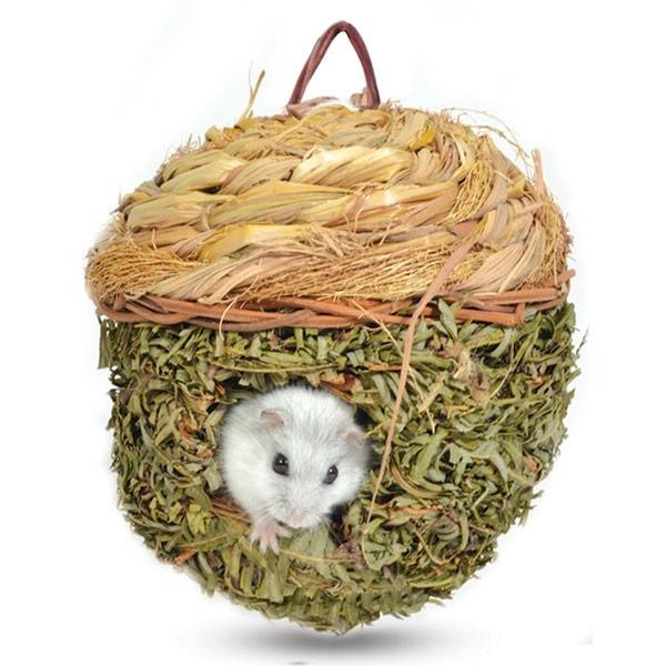 Плетеный дом с круглой крышей от Триол предназначен для всех пород грызунов и птиц. Изготовлен из высушенной лозы и листиков разнообразных растений. Конструкция размером 150 мм легкая и прочная. Специальное кольцо сверху позволяет надежно закрепить домик в клетке или другом месте. Приятный запах свежего сена понравится питомцам.