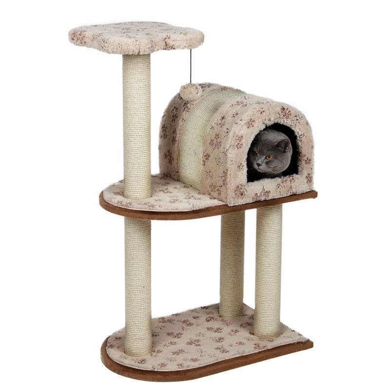 - Трехуровневый комплекс развлечений с платформами, уютным домиком в центре, столбиками-когтеточками из сизаля и шариком на резинке.