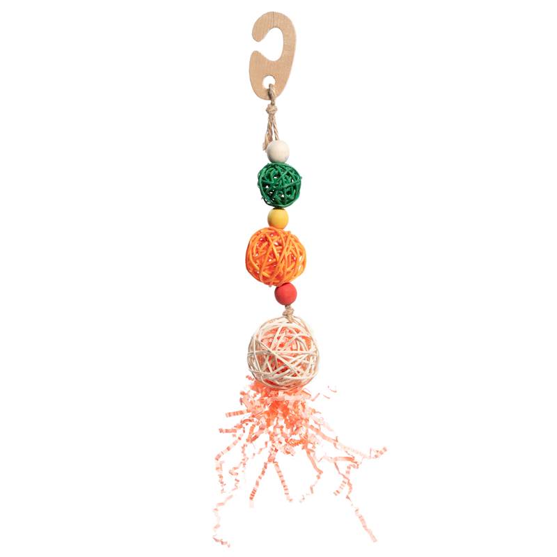 Игрушка-подвеска для птиц в виде трех плетеных шариков, цветных деревянных деталей и хвостика из бумаги.Преимущества:
